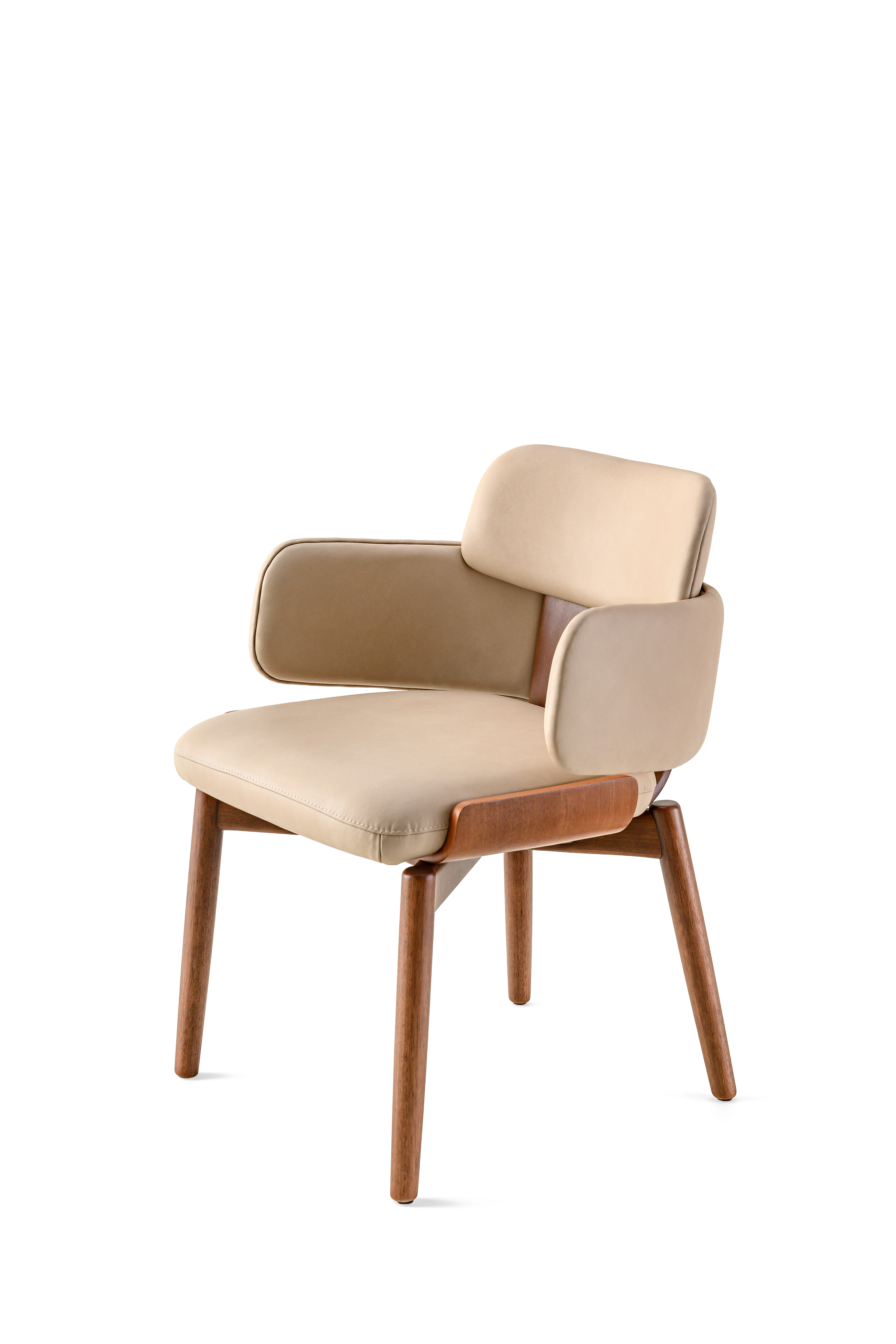 Its curved backrest and arms—echoing the motion of canoes gliding across water—gently embrace the user with comfort and support. The combination of the fabric’s soft touch and the lightness of the wooden lines creates a perfect balance between aesthetics and ergonomics, turning each use into a sensory and refined experience.